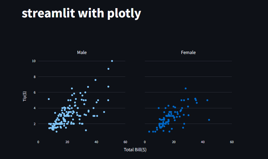해당 코드는 Streamlit과 Plotly를 사용하여 성별에 따른 팁(tip) 데이터를 시각화하는 간단한 웹 애플리케이션을 생성하는 코드입니다. 아래는 코드의 주요 부분을 단계별로 설명한 것입니다. 1. 라이브러리 임포트 import streamlit as st import seaborn as sns import plotly.graph_objects as go from plotly.subplots import make_subplots streamlit: Streamlit 웹 애플리케이션을 만드는 데 사용되는 라이브러리 seaborn: 시각화 라이브러리, 여기서는 샘플 데이터를 로드하기 위해 사용 plotly.graph_objects와 plotly.subplots: Plotly를 사용하여 인터랙티브한 차..