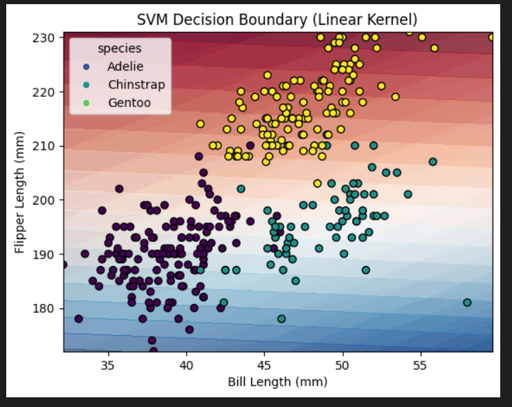 필요한 라이브러리 가져오기: numpy: 수치 계산 라이브러리 pandas: 데이터 프레임 처리 라이브러리 seaborn: 데이터 시각화 라이브러리 sklearn.model_selection: 모델 선택 및 평가 관련 라이브러리 sklearn.svm: SVM 모델 sklearn.metrics: 모델 평가 지표 sklearn.preprocessing: 데이터 전처리 matplotlib.pyplot: 그래프 그리기 라이브러리 펭귄 데이터셋 로드: sns.load_dataset("penguins")를 사용하여 seaborn 라이브러리에서 기본 제공하는 펭귄 데이터셋을 로드합니다. 데이터 전처리: 결측치를 제거하고, LabelEncoder를 사용하여 'species' 열의 범주형 변수를 숫자로 인코딩합니다. 인..