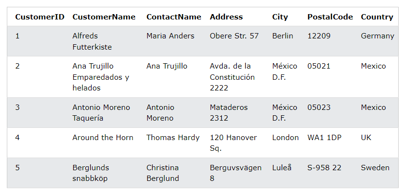 다음은 Northwind 샘플 데이터베이스의 "Customers" 테이블에서 선택한 항목입니다.