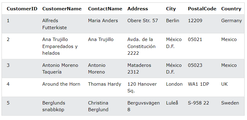다음은 Northwind 샘플 데이터베이스의 "Customers" 테이블에서 선택한 항목입니다.