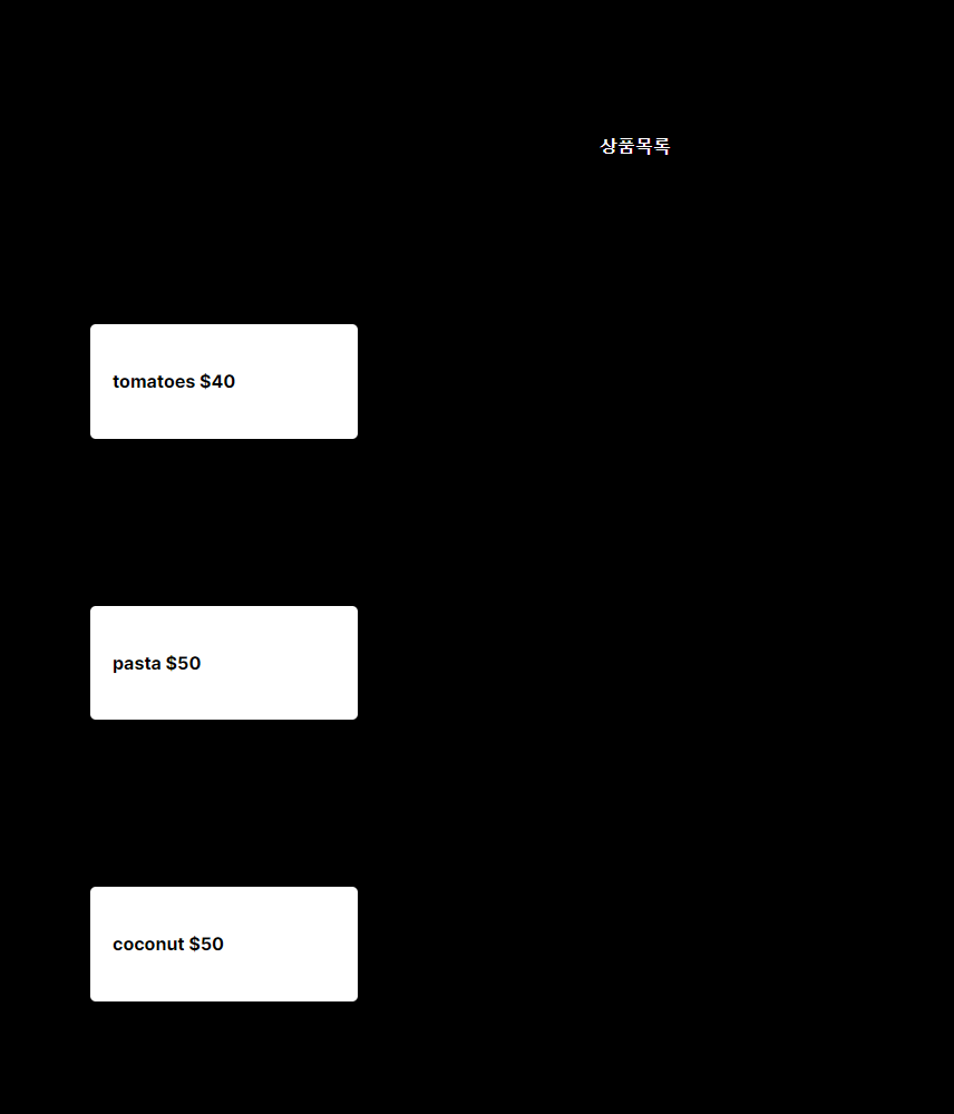 이후 JSX 코드 내부에서 상품 리스트를 출력하기 위해 map 함수를 사용하는 대신, 각각의 상품을 배열의 인덱스를 이용하여 출력합니다. 이 때, {상품[0]} $40, {상품[1]} $50, {상품[2]} $50과 같이 상품의 이름과 가격을 하드코딩하여 출력합니다.