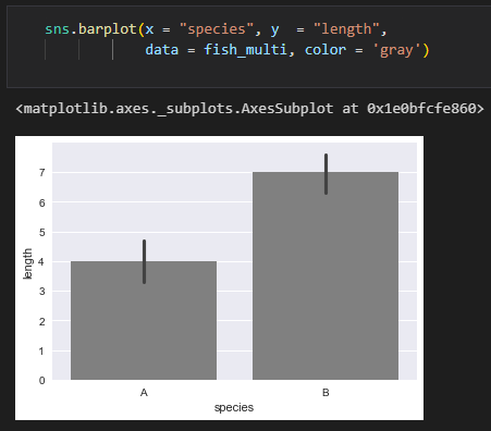 sns.barplot은 주어진 데이터를 바탕으로 각 범주형 변수(category)의 값에 대한 평균값을 막대 그래프로 시각화해주는 함수입니다. x축은 범주형 변수를, y축은 해당 변수의 평균값을 나타냅니다. fish_multi 데이터에서 species 변수를 범주형 변수로, length 변수를 평균값을 계산할 대상으로 지정하여 시각화할 수 있습니다. 이 코드는 fish_multi 데이터에서 species 변수를 범주형 변수로, length 변수를 평균값을 계산할 대상으로 지정하여 시각화합니다. 즉, 각 어종(species)별로 길이(length)의 평균값을 막대 그래프로 시각화합니다. 색깔은 회색(gray)으로 지정합니다