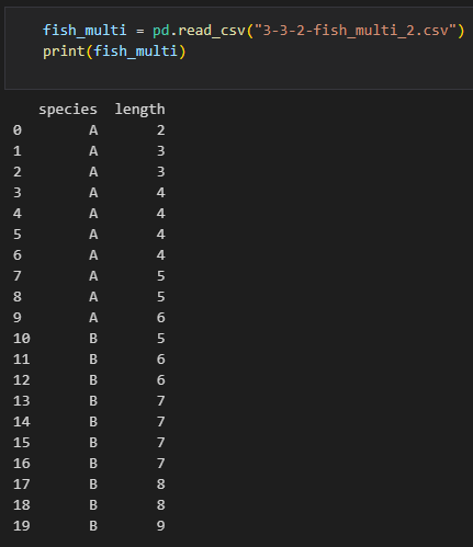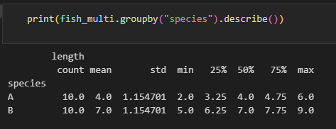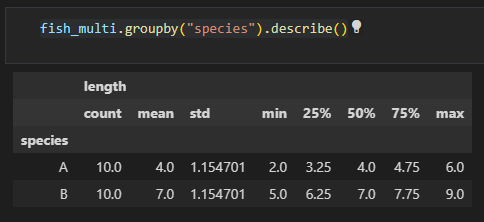 fish_multi 데이터프레임을 "species" 열을 기준으로 그룹화하고, 각 그룹별 통계량을 요약해서 출력합니다. 통계량으로는 count(데이터 개수), mean(평균값), std(표준편차), min(최소값), 25%, 50%(중앙값), 75%, max(최대값)가 있습니다. describe() 함수는 그룹화된 데이터프레임의 각 열마다 위 통계량을 계산하고 출력합니다.