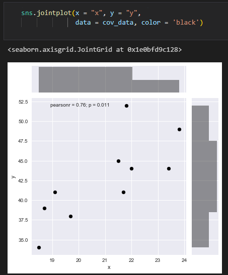 jointplot은 두 변수 간의 관계를 시각화하는데 사용됩니다. 주어진 데이터셋에서 x 변수는 x축에, y 변수는 y축에 대응되며, 데이터 포인트는 산점도로 나타납니다. jointplot은 또한 각 변수의 분포도를 볼 수 있는 히스토그램도 함께 제공합니다. 또한, kind 매개변수를 이용하여 육각형 맵, 커럴 플롯 등 다양한 유형의 차트로 시각화할 수도 있습니다.