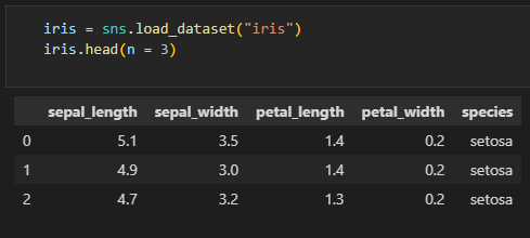 load_dataset() 함수는 seaborn 라이브러리에서 제공하는 데이터셋을 불러오는 함수입니다. 위 코드에서는 iris 데이터셋을 불러와서 변수 iris에 저장했습니다. iris 데이터셋은 붓꽃의 꽃받침 길이, 꽃받침 너비, 꽃잎 길이, 꽃잎 너비, 그리고 붓꽃의 품종 정보가 포함되어 있습니다. head() 함수를 통해 데이터셋의 첫 3행을 출력해보았습니다.
