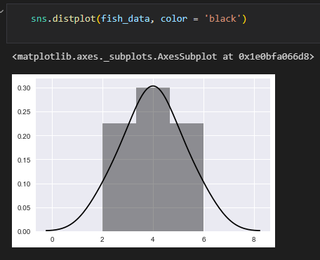 아래 코드에서 fish_data는 시각화하려는 1차원 데이터이며, bins는 히스토그램에서 막대의 개수를 지정하는 인자입니다. kde는 밀도 그래프를 나타내는 것으로, 기본값은 True입니다. color는 시각화 색상을 지정하는 인자입니다.