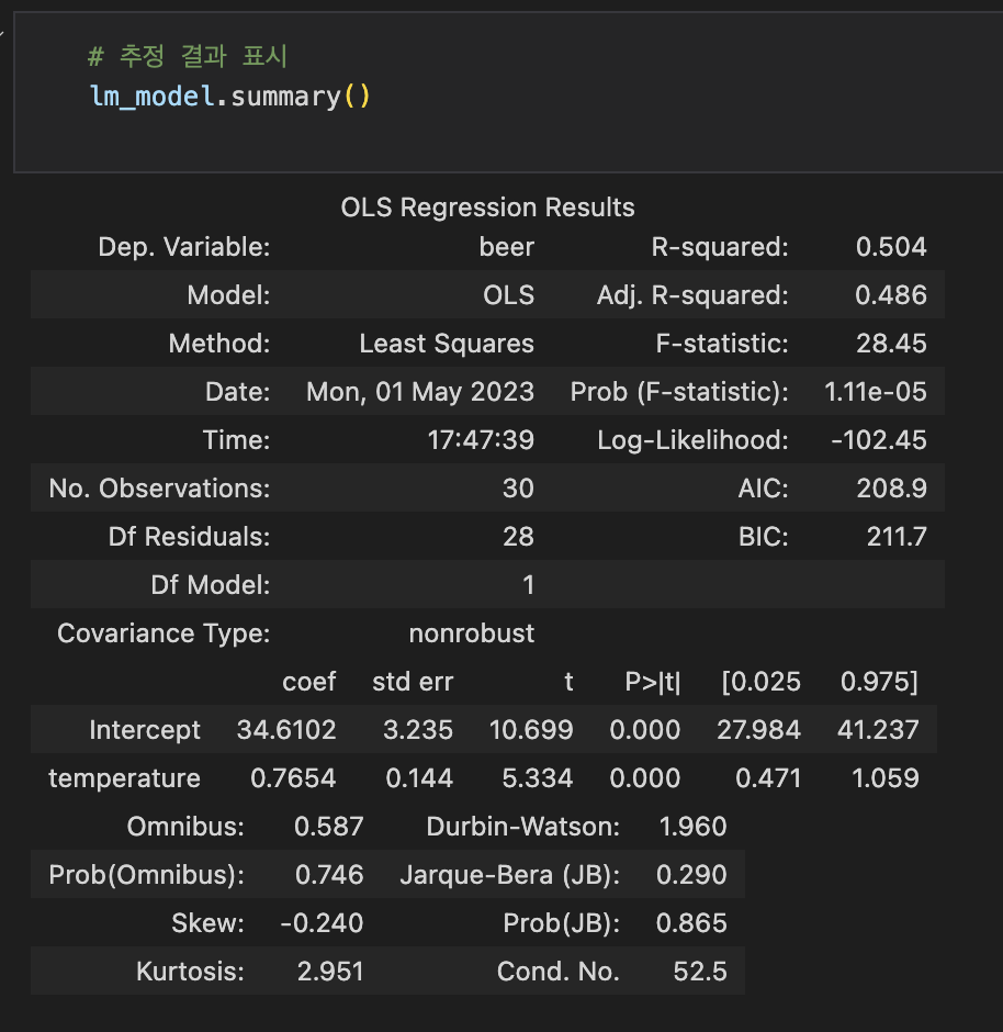 lm_model.summary() 코드는 statsmodels 패키지에서 제공하는 선형 회귀 모델 객체(lm_model)의 summary() 메서드를 호출하여 추정 결과를 요약하여 출력합니다.