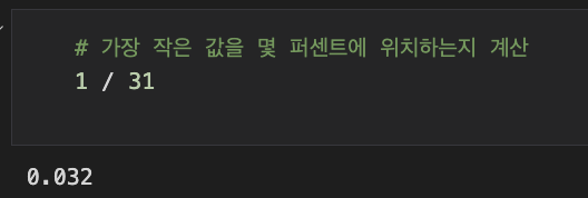 위 코드는 전체 데이터에서 가장 작은 값을 몇 퍼센트에 위치하는지 계산하는 것입니다.