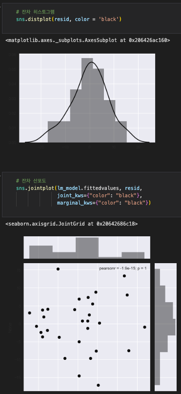 첫 번째 코드인 sns.distplot(resid, color='black')은 잔차의 분포를 히스토그램으로 나타내는 코드입니다. resid는 선형 회귀 모델의 잔차를 나타내는 변수입니다. sns.distplot 함수를 사용하여 잔차의 분포를 시각화하고, color='black'로 지정하여 검은색으로 표시합니다.