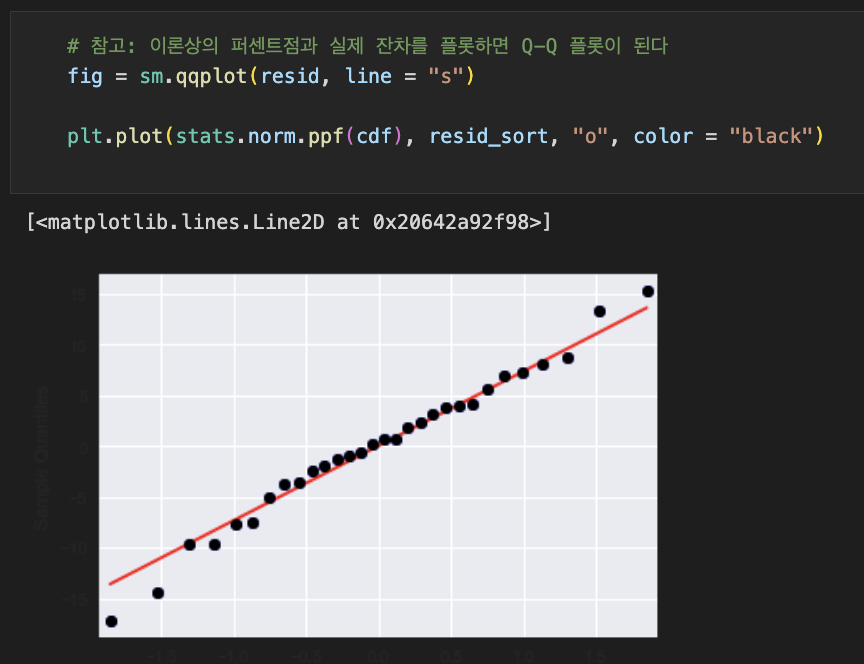 두 번째 줄의 코드인 plt.plot(stats.norm.ppf(cdf), resid_sort, "o", color="black")는 이론상의 퍼센트점과 실제 잔차를 플롯하는 코드입니다. stats.norm.ppf(cdf)는 이론상의 퍼센트점을 계산하여 x축으로 사용합니다. resid_sort는 정렬된 잔차를 y축으로 사용합니다. "o"는 점 형태의 마커를 나타내며, color="black"로 지정하여 검은색으로 표시합니다. 이를 통해 이론상의 퍼센트점과 실제 잔차를 플롯하여 Q-Q 플롯을 구성할 수 있습니다.