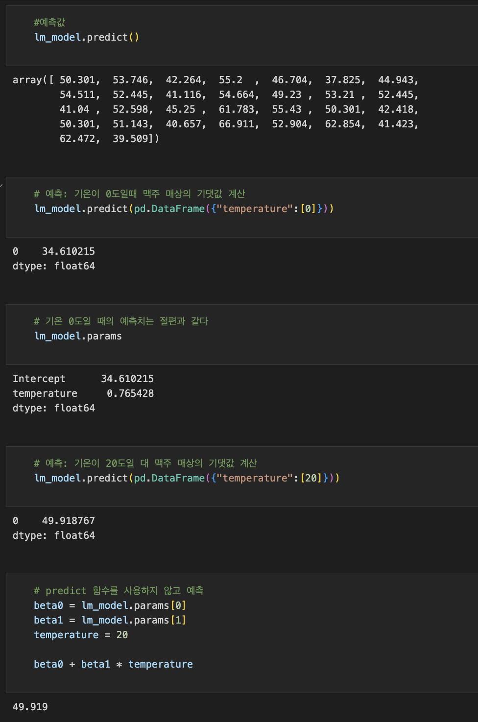 그리고 predict 함수를 사용하지 않고 예측해도 기대값은 동일한 것을 알 수 있습니다!