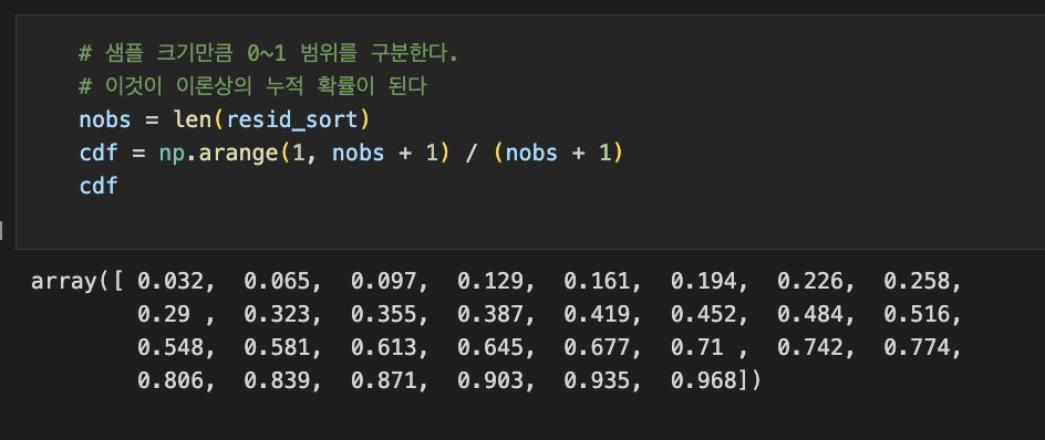 cdf = np.arange(1, nobs + 1) / (nobs + 1) 코드는 1부터 nobs까지의 값을 생성하고, 각 값을 (nobs + 1)로 나누어 이론상의 누적 확률을 계산합니다. np.arange(1, nobs + 1)은 1부터 nobs까지의 값을 생성하는 함수입니다.