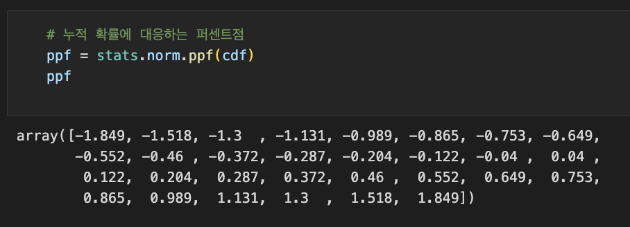 결과인 ppf는 각 누적 확률값(cdf)에 대응하는 퍼센트점을 나타내는 배열입니다. 이 배열은 정규 분포에서 해당 누적 확률에 대응하는 값들로 구성됩니다. 퍼센트점은 해당 누적 확률값을 가지는 분포의 분위수를 의미합니다.