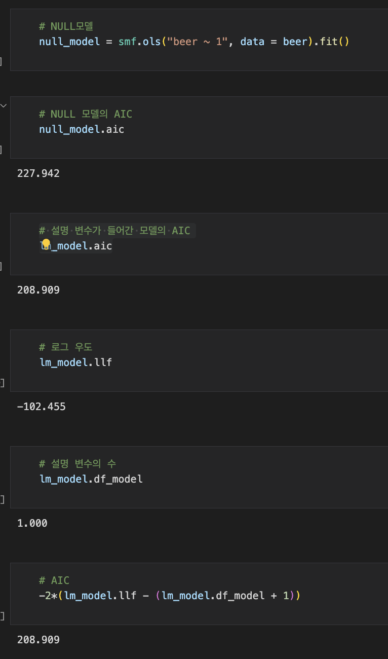 따라서 주어진 코드는 -2 * (lm_model.llf - (lm_model.df_model + 1))을 계산하여 선형 회귀 모델의 AIC 값을 구하는 것입니다. AIC 값이 낮을수록 모델이 더 적합하다고 해석할 수 있습니다.