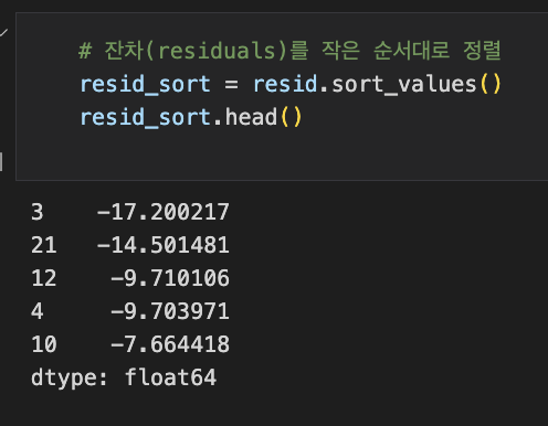 resid_sort.head() 코드는 정렬된 잔차 중에서 처음 5개의 값을 출력하는 것입니다. head() 함수를 사용하여 처음 5개 값을 확인할 수 있습니다.